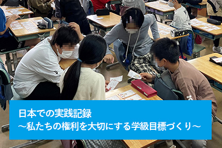日本では、CREの具体的な取り組みとして、「子どもたちの権利が守られる学級憲章(学級目標)づくり」を提唱しています。まず「子どもの権利条約」を通して、子どもの権利とは何かを学びます。そして、この条約に謳われている内容や精神を、これからの一年間を過ごす学級の目標に取り入れ、子どもたち一人ひとりの大切な権利が守られる学級を、先生と子どもたちがともに考えながらつくっていきます。令和4年度には、CREの理念に賛同くださった西東京市立保谷小学校の先生方が、この取り組みを実践してくださいました。