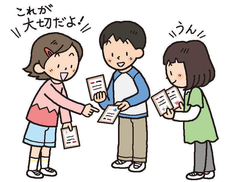 子どもの権利についての学びをもとに、一人ひとりの権利が大切にされる学級をつくるためには、どの条文が特に大切か選んでみましょう。選んだ条文をもとに、学級の課題は何か、どのようにみんなの権利を守っていくかなどをグループで話し合い、先生もともに考えましょう。
