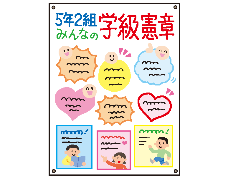 できあがった「学級目標」をポスターにして教室のみんなから見える場所に掲示しましょう。自分たちでデザインも考えてみましょう。また、「学級目標」を定期的にふりかえり、守られていないことはないか、足りないことはないかなど、よりよい学級をつくっていくために話し合いを続けていきましょう。