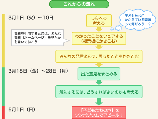 3月1日から28日までのおよそ1カ月間のうち、2回にわけて、ちがったテーマで掲示板上でネットワーカーどうしで意見交換をします。自分たちが思ったこと、わかったことを掲示板に自由に書いてください。各回の最後には、その回のまとめが発表されます。