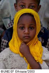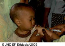 私はラハム。6歳の女の子です。アフリカのエチオピアにある南ウォロという村に住んでいます。今日は初めて予防接種(よぼうせっしゅ)を受けたのよ。ちくっとしてちょっと痛かったけど、お兄ちゃんやお姉ちゃんみたいに泣かなかったわ。えらいでしょ。この注射で、「はしか」っていう怖い病気にならなくてすむんだって。はしかになると、目が見えなくなっちゃったり、肌から血でたりして死んでしまうの。空気でうつるから毎日たくさんの人が死んでいってとても悲しいわ。今までは病気になるとレモンの汁やユーカリの葉っぱで治していたけどよく治らなかったの。今ではユニセフの人たちが注射をしてくれるから、怖い病気になる心配をしなくていいのよ。