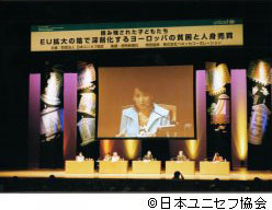 2004年5月21日、東京有楽町にある東京国際フォーラムで「ユニセフ国際シンポジウム」が開催(かいさい)されました。2004年5月1日にEUが拡大して、25カ国になり、そのことによって今までよりもお金や人間の流れが自由になります。良いことがあるいっぽうで、子どもの人身売買(じんしんばいばい)の問題が深刻化(しんこくか)すると考えられています。このテーマに関心のある3,200人以上の人たちが集まりました。