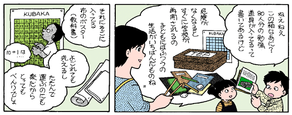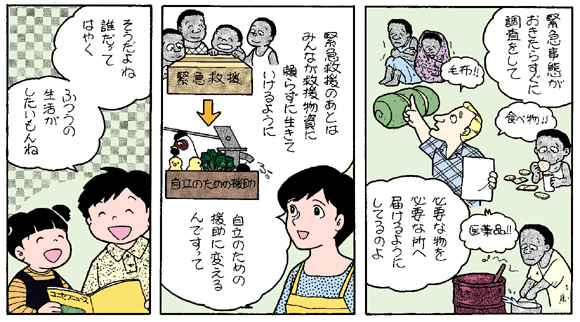 ※緊急支援用の毛布が1枚3.97米ドル(476.4円)、教員と生徒80人分の学用品セット「箱の中の学校(School in a Box)」が54.4米ドル(6528円)で、提供することができます。(物資の金額は2004年6月現在/日本円は1米ドル=120円として計算しています)