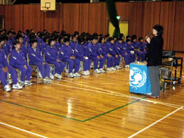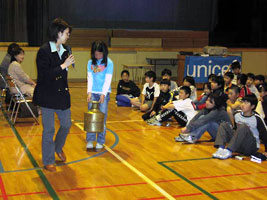 日本ユニセフ協会では、4年で全国をまわれるように、春と秋にユニセフキャラバンキャンペーンを行っています。2004年の春のキャンペーンでは、静岡県、岐阜県、愛知県、北海道を訪問して、小学校・中学校でも「ユニセフ学習会」を開きました。