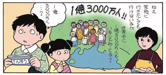 みなさんは、学校に通っていますよね。けれども、世界には学校に行けずにいる子どもたちがまだたくさんいます。読み書きをならうことはもちろん、自分の夢をかなえるために必要なことを勉強したりする場として、学校はとてもたいせつなところです。ユニセフはすべての子どもたちが学校へ行けるよう活動をしています。