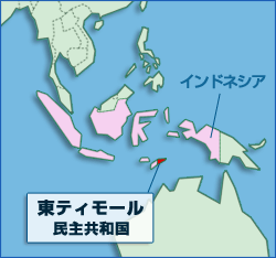 | 東ティモールは、インドネシアの西、オーストラリアの北に位置する長野県程度の大きさの小さな国です。長い間ポルトガル、インドネシアの占領下にありましたが、1999年に独立をするかどうかの国民投票が行われ、独立に賛成する票が78.5%集まりました。しかし、投票後インドネシア併合派による暴力などで騒乱状態になり、国のあちこちで暴力や破壊行為が行われました。騒乱がおさまった後、国連の支援で独立にむけて国づくりをし、2002年5月に独立をはたした世界で一番新しい国です。ここでは、2003年9月に視察した東ティモールのようすをご紹介します。 |