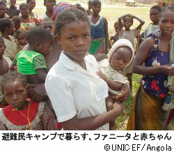 アンゴラは30年間内戦が続いており、住んでいた家を追われ国内避難民になった人たちが約400万人いるといわれています。ファニータちゃん(17歳)は6歳のときに父を地雷で失い、武装した兵士から身を守るために、住まいをあちこに変えて、かくれるように生活してきました。7歳になったときに突然やってきた兵士に母を殺され、ファニータちゃんは兵士に連れ去られ、日頃暴力をうけながら生きてきました。子どもを出産しましたが、父親が誰かはわかっていません。現在は避難民キャンプで赤ちゃんと2人で暮らしています。