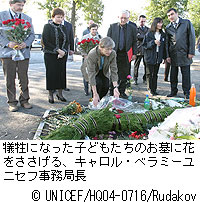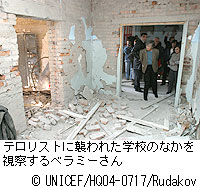 2004年10月12日にユニセフ事務局長のキャロル・ベラミーさんは、テロリストが、1000人以上の人質をとって学校にたてこもった事件のその後を視察するため、ロシアのベスランを訪れました。およそ172