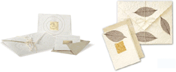 グリーティング・カード「タイの輝き」「タイのこもれび」は、タイ北部の山岳地帯にくらす人びとが、サー・ペーパーと呼ばれる手すき紙を使い、手作業で仕上げたカードです。原料にはサーの木と呼ばれる、タイ北部に自生する樹木の樹皮が使われており、木を伐採することなく紙を作ることができます。この開発プロジェクトは、少数民族の人びとに働くチャンスを与え、地域が自分たちだけの力で活動することを支援するとともに、そこから得られる収益は、子どもたちへの教育の普及にも役立てられています。