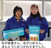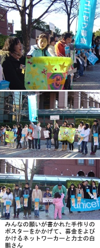 中央大会では、アグネス・チャンさんとネットワーカー代表の渡辺濯くんの宣誓のかけごえで街頭募金がスタートしました。前半の1時間は、ゲストのモンゴル出身の力士白鵬さんといっしょに募金をよびかけました。白鵬さんは、この日19歳9カ月の若さで新小結に昇進するという記念すべき日でした。そのあと20分間はステージの近くで、ネットワーカーだけで活動をしました。「今日は貴重な体験をさせてもらいました。ものすごく寒かったけれど、募金してくれる人をみるとその瞬間だけは寒さをわすれました」と小林登子さんは感想を送ってくれました。