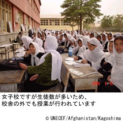 アフガニスタンはイスラム教の国です。以前は、女の子は自由に外を歩くこともできませんでした。今ではユニセフなどの支援で、女の子も学校に行くことができますが、12才以上の女の子は大人としてあつかわれ、家の手伝いや結婚をして、学校をやめさせられたりします。その結果、下働きをさせられたり、小さいうちに子どもを産んで、母子共に危険にさらされたり、いろいろな問題があります。ですから、彼女たちがまた学校に戻って、教育を受けられるようにしなくてはいけないと思います。