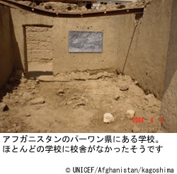 アフガニスタンでは、来年3月に選挙があります。アフガニスタンが平和な国になるためには、アフガニスタンの人たちが自分たちでどうすればいいか考える必要があると思います。それには長い時間がかかります。でも、自分たちの国なので、自分たちが先頭に立って行動しなくてはいけません。ユニセフは例えば、学校建設の仕事をアフガニスタンの人たちにお願いしています。アフガニスタンが自立するために、国連やユニセフがこれからも支援をしていきます。 |