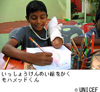モルディブでは、1月の末には、新学期がはじまってしまいます。ユニセフは、子どもたちがそのときに学校にきちんと戻れるようにするためにも、まず、子どもたちの心を元気にすることが大事だ、と考えて、いろいろな支援活動をつづけています。