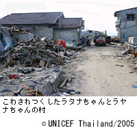 二人は今、タイの南、バン・ムアン地区にある津波の被害を受けた人たちの避難所で、小さなひとつのテントの中で暮らしています。住んでいたバン・ナム・ケム村は、漁師さんたちの村でしたが、津波で今はあとかたもなくなってしまいました。