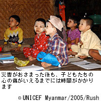ユニセフは、ミャンマーでも懸命の支援活動をつづけています。避難している人びとにさまざまな支援物資をとどけたり、きれいな飲み水が手に入るように水道施設をなおしたりしています。でも、子どもたちの病気と同じように心配しているのが子どもたちの心のことです。ユニセフは、ほかの国でもおこなわれているように、ソエちゃんたちのような心の傷を負った子どもたちが早く学校にもどり、心の元気をもう一度とりもどすための活動をすすめています。 |