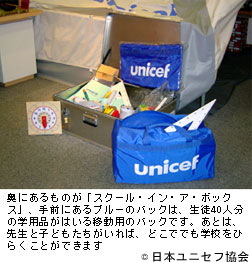 ユニセフは、津波の被害によって苦しんでいる子どもたちを守るため、いろいろな活動をしています。水、薬、テントや毛布を届けたり、子どもたちと家族の居場所をいっしょうけんめい探しています。ユニセフがもっとも力を入れているのは、子どもたちを学校に戻すことです。学校やかわりの教室を建てるお手伝いをしたり、先生1人分と生徒80人分、およそ1クラス分の教科書や文房具が入った「スクール・イン・ア・ボックス(箱のなかの学校)」を配っています。ほかにも、スポーツキットや遊び道具が入っているレクリエーション・キットがあります。