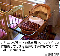 たとえば、ここ、カリニングラードにある保育園では、あずけられている23人の赤ちゃんの大半は、麻薬の注射によってHIVウイルスに感染したお母さんに捨てられた赤ちゃんです。こんな保育園や孤児院が国中にたくさんあるのです。