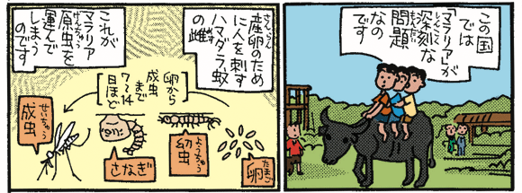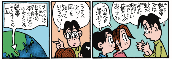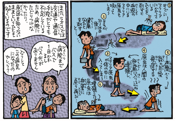 熱帯の国ぐにでは、マラリアという病気が問題になっています。マラリアにかかると、ひどいときには命をおとす場合があります。さて、マラリアとは、どんな病気なのでしょうか。また、どのようにすればふせぐことができるのでしょうか。ラオスの国のお話をつうじて、マラリアについてみていきましょう。