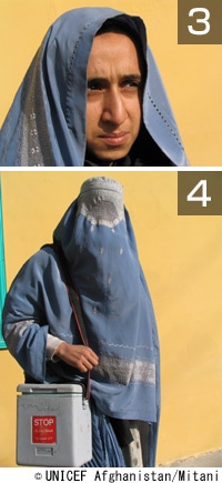 外来医療センターで、予防接種員として働くアジザ(写真2)によると、一日に50人から80人の子どもたちが予防接種にやってくると言います。「教育を受けていない母親にも分かるように、予防接種のことを説明しています。でも、一カ月後に戻ってくるように言っても、パキスタンの難民キャンプに戻る人もいるし、田舎に行く人もいるし…来なかった人をこちらから探すような仕組みはないんです」
