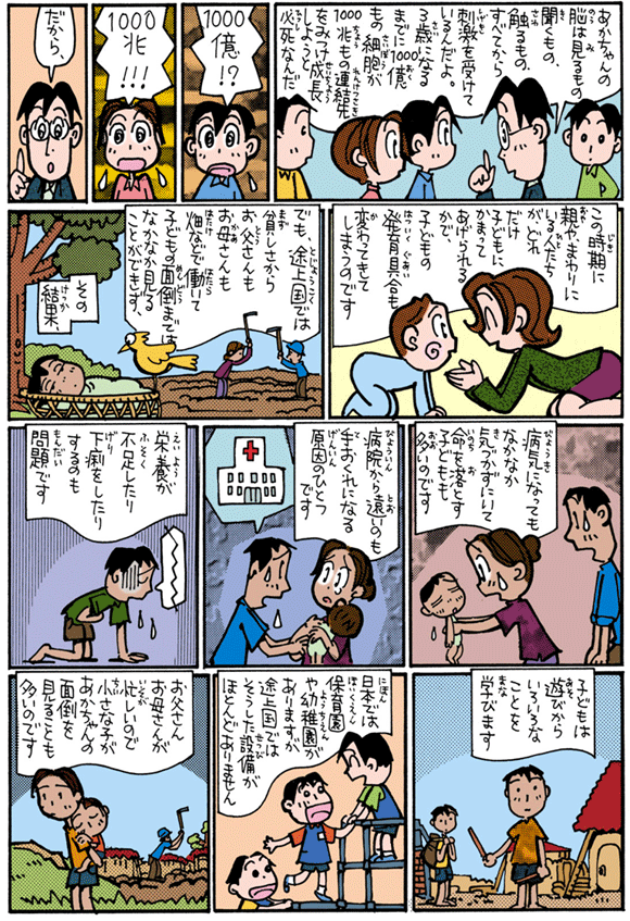 乳幼児期はなぜ大切なのでしょうか。子どもは生まれたとき、すでに約1000億の脳細胞をもっています。それでもまだ完成していない状態です。その後、さまざまなしげきを受けながらたくさんの情報をためこんでいきます。この時期は二度ともどらない、大切なものなのです。