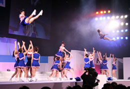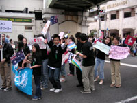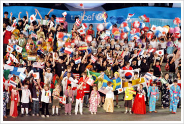 地元の子どもたちや世界各国の伝統衣装、ダンス、音楽で表現する子どもたちが参加し、「ユニセフ子どもの祭典」のオープニングをもりあげました。参加グループのなかには、日本の子どもたちはもちろん、ブラスバンド、チアリーディング、日本のダンスグループのほかに、インターナショナルスクール、インドネシア、朝鮮、ロシアの子どもたちによるグループが、色とりどりの服や、各国の民族衣装を来て行進し、両国をはなやかにいろどりました。 |