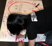 国技館のエントランスでは、ユニセフ子どもネットのスペースをもうけました。事前に掲示板をつかって、なにをするかを話しあったところ、「お客さんも、子どもたちも、参加者みんなができる何かをしたい!」ということになりました。1週間前に、ユニセフ子どもの祭典に参加するネットワーカーが集まり、具体的にどのようにするかを話あい、メッセージを書いてもらって大きなパネルに貼ってみんなのメッセージでいっぱいにしよう!という企画に決定し、準備がすすめられました。