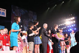 このイベントの最後には、子どもたちによるステージが行われました。ステージでは、子どもたちによるダンスや演奏が行われ、ケント・ギルバートさん、松村邦洋さん、天テレきっずも応援にかけつけてくれました。4月で任期が終了した、キャロル・ベラミーユニセフ前事務局長へ、ネットワーカーより花束がプレゼントされました。