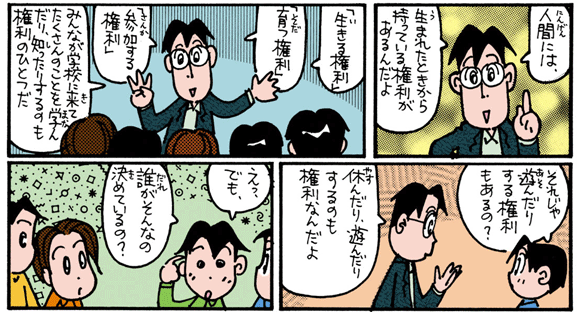 子どもはひとりの人間として、生まれながらにして権利をもっています。成長の途中にある子どもにも「子どもにも権利があるのだ」ということが知られていないこともあります。みなさんひとりひとりにある大切「子どもの権利」についていっしょに考えてみましょう。
