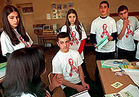 このような問題に対して、アルメニアではユニセフとAPECという団体が協力して、エイズについて教える「子ども教師」を育成しています。首都エレヴァンにある第43学校では、APECのセロファンさんが14歳から16歳の子どもたちにエイズの歴史、感染の仕方、予防法を説明して、その子どもたちが友達に話をする手伝いをしています。
