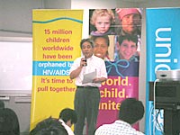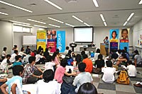 2005年8月9日、ユニセフ子どもセミナーがユニセフハウスで行われました。今回のテーマは「HIV/エイズ」。HIV/エイズはなにかという話から、日本や世界での状況、そして子どもたちのようすを知り、自分たちでできること、おとなに行動してもらいたいことを考えました。50人以上の子どもたちをはじめ、おとなや大学生などHIV/エイズや世界の状況について関心がある人たちがあつまりました。