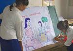 <ライフスキルクラスのために準備した絵を見せているセンさんとお友達>