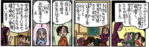 「勉強したくても勉強することさえゆるされなかった…」。アフガニスタンの子どもたち(とくに女の子)は、これまでに多くの権利をうばわれてきたことはみなさんも知っているとおりです。政権が変わった今、「私は先生になりたい!」「私はお医者さんになりたい!」今、子どもたちは未来にむかってはばたく準備をしています。