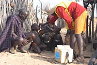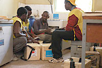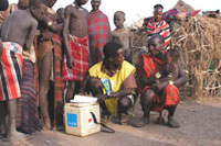 南部諸民族州ハマル地方で活動する全国ポリオ予防接種の日のボランティアの人々。1平方キロあたりの人口が4.9人という、人口がとても少ない村や農場に向かうため、ワクチン運搬器にワクチンを詰めているところです。これから一軒一軒の家を訪問して、5歳未満の子ども全員にポリオのワクチン接種を行います。