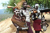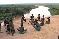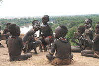 南部諸民族州南オモ地区のコルチョ村付近を流れるオモ川のほとりで歌をうたい、遊んでいるのは、ポリオ根絶活動の最前線にいるカロ族の子どもたちです。