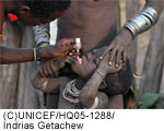 ▲エチオピアで保健スタッフがポリオワクチンをうけた子どものつめにマーカーでしるしをつけていく