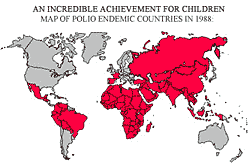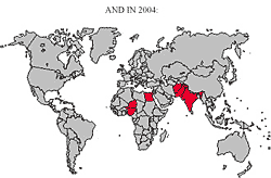 1998年にはポリオに感染している子どもは35万人いました。2003年には784人となり、99%もへりました。1998年に感染した子どもたちは125カ国にいましたが、2003年には、6カ国(ナイジェリア・インド・パキスタン・ニジェール・アフガニスタン・エジプト)まで減りました。しかし、2004年に世界からポリオがなくなるというあと一歩というところで、アフリカ西部と中央部にふたたびポリオの脅威(きょうい)がおそってきたのです。