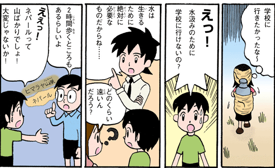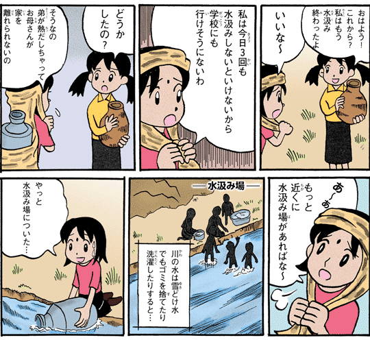 きれいな水を飲むことができない人の数は、世界で10億人以上。水道をひねれば、水がでてくる私たちの生活からは想像がつきませんが、世界の子どもたちの多くは、みずくみの仕事におわれて、学校にいくことができません。