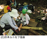 2005年8月に行われたサマーキャンプのテーマは“水”でした。“水”を通し開発途上国の子どもたちの生活を知ろうというものでした。3泊4日のキャンプの中で、子どもたちはいろいろな経験をしました。実際に、炎天下の山道で水運びもしました。その運んだ水は、グループごとの生活水となります。何にどれくらい使ったか印をつけながら、顔や手を洗ったり、食器を洗ったりしました。参加した子どもたちからの感想は、『こんなにも水運びが大変なものなのか』ということでした。そして途上国の多くでは、水くみは女の子の仕事とされていることが多いことを知り、勉強や遊ぶこともできず子どもらしい時間を過ごせないでいる子どもたちが世界には多くいることを知りました。