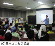 | ユニセフ活動や“水”についてまなぶ時間。講師は、当協会の広報室長 |