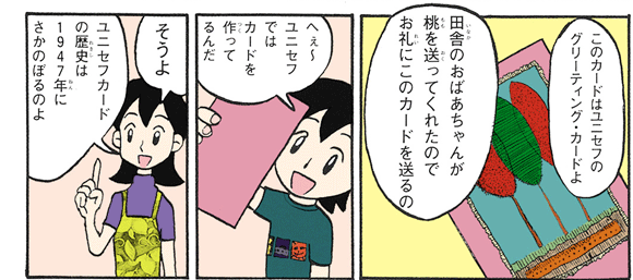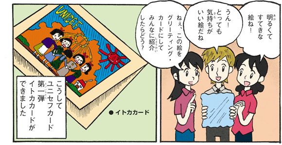 ユニセフのカードやギフトをしっていますか?みなさんのなかに、グリーティングカードやハガキを使ってくれている人もいると思います。このカードやギフトの代金の約50パーセントが現地の支援活動に役立てられています。今回はどのようにしてカードが作られているのかをお話しましょう。