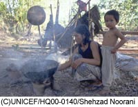 家で料理用の火を起こす女性と子ども(カンボジア) |