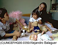 HIVに感染している母親とベッドの上で遊ぶジョアオ6歳とジェシカ4歳(ブラジル)