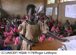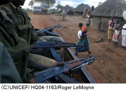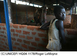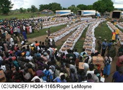 反政府勢力(LAR)から逃げ出したり、軍隊にとらえられた1万5千人の子どもたちのうち、1万人は社会復帰センターで支援を受けています。ここでは、ユニセフが心理的ケアのサービスを提供できるよう、地元のボランティアの人びとにトレーニングを行っています。また少年兵が、彼らのコミュニティにふたたびもどれるように助ける活動もしています。