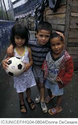 | サッカーボールを大事そうに抱えて寄り添う子どもたち。彼らの家はゲリラにおそわれ燃やされてしまったそうです。 |