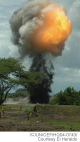 1990年から2006年4月にかけて、コロンビアに住んでいる1,739人が、地雷や不発弾の被害にあっています。そのうち506人は、18歳未満の子どもです。地雷の被害者はここ数年で大幅に増えてきています。また地雷や不発弾は、コロンビアの32州中の31州にあります。戦いが行われる場所だけでなく、学校や水道や地方へ行く道でも多く見つかっているのです。ユニセフは、政府とコロンビアにある14以上の市民団体にはたらきかけ、地雷の危険性について多くの人に知ってもらい、未然に事故を防ぐ活動や地雷や不発弾で被害をうけた人たちの支援をしています。