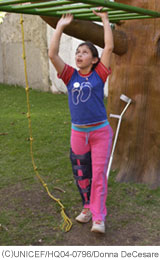 | 地雷で片足を失った9歳の少女。ジャングルジムで義足で歩く練習をしています。 |