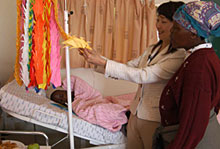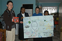★子どもエイズセミナーで作ったフラッグや、届いたお手紙は、10代の母センターで手わたされました。20歳までの29人の母親と29人の子どもたちがいました。3日前に子どもを産んだ19歳の女の子(HIV陽性なのだそうです)もいました。このセンターは、10代で妊娠したお母さんと子どものための施設です。エイズの知識を伝えたり、母子感染を防ぐための活動や、自立していくための方法などを教えています。