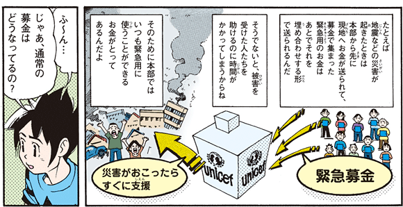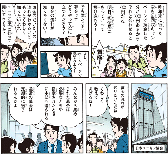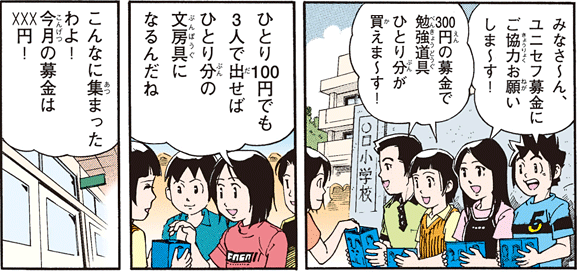 みなさんは、ユニセフ募金をしたことがありますか。さて、募金は、どのようにして本部に送られて、どんなかたちで現地にとどけられるのでしょうか。今日は募金の流れについてごしょうかいします。