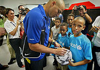| 世界的にも有名なブラジルのサッカー選手ロナウド。ユニセフが支援しているプロジェクトに参加する少年が持っているボールにサインをしている。 |