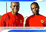 | アンゴラのストライカーのペドロ・マントラス(左)とチームキャプテンのファブリス・アクワはアンゴラの予防接種キャンペーンを広めるためTV映像に出演。 |